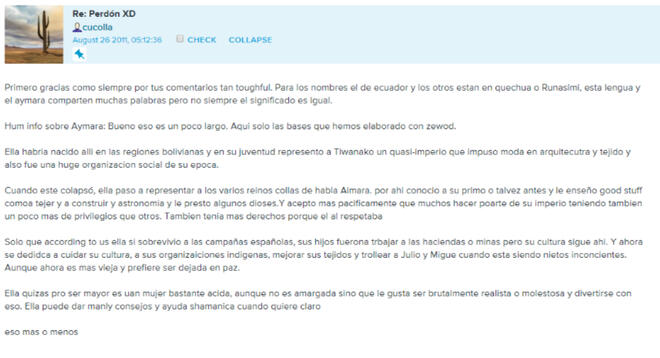 Se dio cuenta muy pronto que era excepcional, porque ella sabía la historia de los collas y los chamanes de los reinos se la disputaban y los guerreros querían poner las manos sobre su cabeza. Le atribuían muchos orígenes a la niña, el mar, que algunos ancianos había visto en sus viajes, el sol la luna o el lago Titicaca con el que le pedían que hable. Ella sabía que no era nada de eso, y se lo confirmaron los de su clase que vio cuando subió al norte su origen eran más la lengua de su pueblo, los hechos de los guerreros, ella era los Colla, los aimara y no había nacido de mujer.